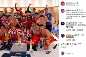 馬競前鋒朱利亞諾·西蒙尼社媒曬出與隊(duì)友們在更衣室內(nèi)的大合照,配文:“愛上馬競,這種情感你無法理解!我們晉級決賽了!加油,永遠(yuǎn)!”