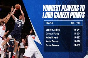 第三至第五分別為科比(19歲127天)、杜蘭特(19歲146天)、布克(19歲162天)。