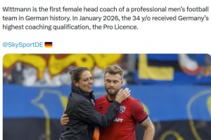 報道稱維特曼自2024年5月起擔(dān)任該隊主教練。她是德國歷史上首位執(zhí)教職業(yè)男子足球隊的女性主教練。2026年1月,34歲的她獲得了德國最高級別的教練資格——職業(yè)級教練證書。