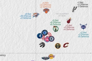 體育資訊3月6日訊 今天,美媒Kirk Goldsberry曬圖統(tǒng)計(jì)了NBA過(guò)去10場(chǎng)比賽所有球隊(duì)的攻防效率,詳情入下: