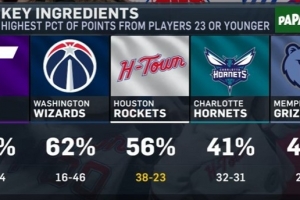 火箭主場(chǎng)迎戰(zhàn)開拓者,轉(zhuǎn)播方曬出本賽季23歲及以下球員得分占球隊(duì)總分比重最高的五支球隊(duì),分別是: