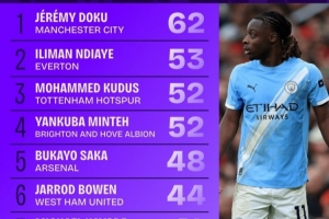 埃弗頓的恩迪亞耶以53次排在第二位,熱刺的庫杜斯和布萊頓的明特以52次過人分列三四位。
