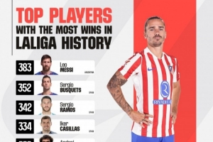 體育資訊3月8日訊 西甲統(tǒng)計(jì)了球員在該聯(lián)賽的取勝場次,并列出西甲歷史勝場排名,梅西383勝居首,格列茲曼310勝躋身前十。