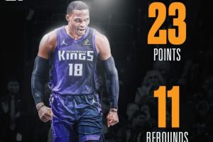 本場(chǎng)比賽,國(guó)王球星拉塞爾·威斯布魯克發(fā)揮出色,不僅在三分線外保持著高效,組織端也亮點(diǎn)十足,頻頻送出妙傳,喂得雷諾心花怒放!此外,失誤控制方面他也表現(xiàn)的極其出色。