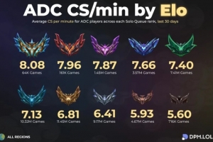 體育資訊3月9日訊 外媒統(tǒng)計單排各分段ADC玩家分均補刀: