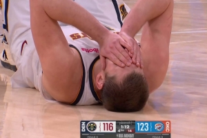 那次犯規(guī)時掘金116-123落后7分,約基奇兩罰一中,繼續(xù)發(fā)球之后他再中一記三分,將分差縮小至3分。