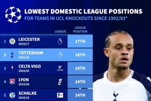 體育資訊3月10日訊 德國轉會市場統(tǒng)計了歐冠改制以來淘汰賽球隊的聯(lián)賽排名,并列出聯(lián)賽排名最低歐冠淘汰賽球隊榜單,本賽季熱刺排名僅高于2016-2017賽季的萊斯特城。