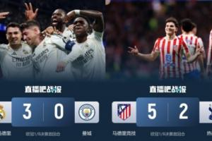 其中皇馬送給曼城3-0的慘敗,馬競送給熱刺5-2的慘敗,巴薩則是客場1-1平紐卡。目前三隊晉級歐冠8強的概率都高于對手。