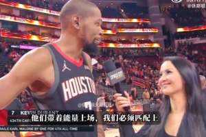 體育資訊3月14日訊 NBA常規(guī)賽,火箭107-105擊敗鵜鶘。賽后杜蘭特接受記者瓦妮莎的場(chǎng)邊采訪。