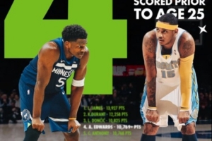 愛(ài)德華茲25歲前的總得分超越卡梅隆·安東尼,上升至NBA歷史第四,僅次于詹姆斯、杜蘭特和東契奇。