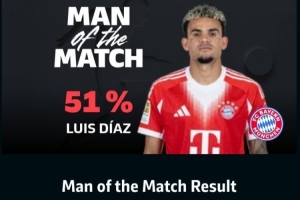 體育資訊3月15日訊 德甲第26輪,拜仁客場1-1戰(zhàn)平勒沃庫森,賽后拜仁邊鋒路易斯·迪亞斯51%得票率當(dāng)選全場最佳球員。