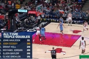 公牛球員吉迪已經(jīng)拿到13分10籃板10助攻的三雙數(shù)據(jù),這是他生涯第30個三雙,他超越格蘭特·希爾,獨占三雙歷史總榜第十九位。