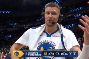 本場比賽,波爾津吉斯出戰(zhàn)26分鐘,13中8,14罰13中砍下勇士生涯新高的30分外加5板4助2斷3帽。