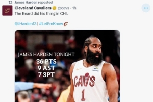 賽后騎士官方曬哈登數(shù)據(jù)海報(bào),配文寫道:大胡子在芝加哥大顯身手。