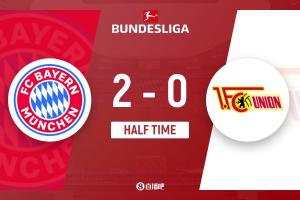 上半場(chǎng)傷停補(bǔ)時(shí)1分鐘,半場(chǎng)結(jié)束,拜仁暫2-0柏林聯(lián)合。