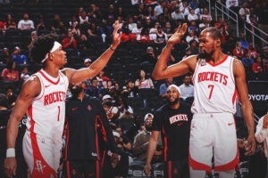賽后火箭官推發(fā)布贏球海報(bào),封面是阿門和杜蘭特?fù)粽扑查g。