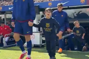 體育資訊3月22日訊 西甲第29輪比賽,巴薩在諾坎普迎戰(zhàn)巴列卡諾。本場比賽之前,巴薩球員手牽唐氏綜合癥球童走進球場,表達了對他們的關(guān)愛。