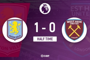 傷停補時3分鐘。上半場比賽結(jié)束,阿斯頓維拉1-0西漢姆。