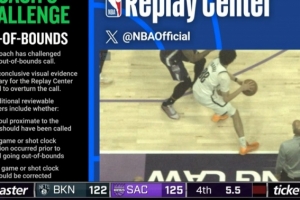 特拉奧雷被兩位裁判同時吹踩線和進(jìn)攻犯規(guī),籃網(wǎng)挑戰(zhàn)失敗,裁判回放后明顯踩線,還是國王球權(quán)