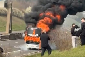 一輛載有球迷的大巴在英國一條繁忙的高速公路上起火燃燒,給前往觀看聯(lián)賽杯決賽的球迷造成交通混亂。這輛起火的大巴停在西米德蘭茲郡M6高速公路3號交匯處附近,據(jù)信車上載有曼城球迷。