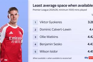 在英超球員持球時(shí)的平均“可行動(dòng)空間”排行榜上,約克雷斯以3.28米的數(shù)據(jù)排名英超最低,遠(yuǎn)低于其他球員。