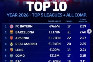 體育資訊3月24日訊 德轉(zhuǎn)盤點了2026年五大聯(lián)賽球隊在各項賽事場均積分榜,其中拜仁居首,具體如下: