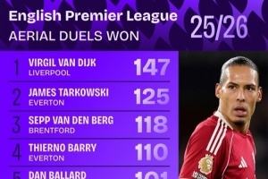 體育資訊3月24日訊 Squawka統(tǒng)計(jì)了本賽季球員在英超的爭頂成功次數(shù),并列出榜單,范戴克147次居首,并且他的成功率為75.77%,爭頂100+球員中最高。