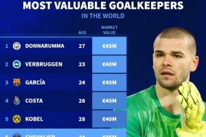 體育資訊3月25日訊 德國轉(zhuǎn)會(huì)市場(chǎng)統(tǒng)計(jì)了門將的最新身價(jià),并列出榜單,多納魯馬4500萬歐居首,維爾布魯根、霍安·加西亞、迪奧戈·科斯塔、科貝爾4000萬歐。