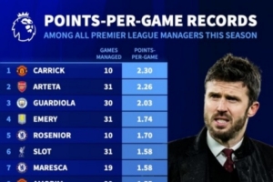 本賽季英超主帥場均積分排名:卡里克2.3分居首,阿爾特塔次席
