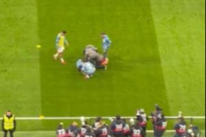 體育資訊01月17日訊 皇馬vs萊萬特賽前,姆巴佩熱身搶圈訓(xùn)練時遭赫伊森誤傷,痛苦捂住腳踝,長時間接受隊(duì)醫(yī)治療后,一瘸一拐起身。