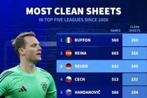 體育資訊3月27日訊 德國轉會市場統(tǒng)計了2000年以來五大聯(lián)賽門將零封場次,并列出榜單,布馮263場居首,雷納、諾伊爾排名二三位。