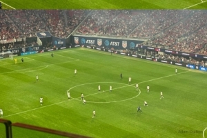 美國(guó)隊(duì)在梅賽德斯-奔馳體育場(chǎng)進(jìn)行本場(chǎng)比賽時(shí),身著為今年夏天世界杯發(fā)布的新款球衣。這款球衣采用了美國(guó)國(guó)旗的色調(diào),球衣上印有波浪狀的紅色和白色條紋,球衣背面則有大面積的白色區(qū)域。