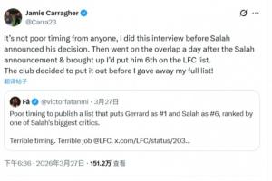 卡拉格回復這名球迷:“這絕非任何人的時機考量失當——我早在薩拉赫宣布決定前就完成了這次采訪。薩拉赫官宣的次日,我才在Overlap節(jié)目里展開后續(xù)話題,提到自己將他排在利物浦隊史榜單的第六位??删銟凡吭谖夜纪暾駟沃埃桶堰@段內容發(fā)布了出去!”