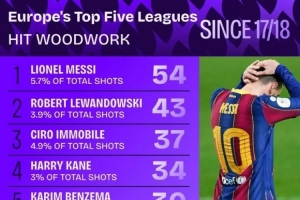 2017-18賽季以來五大聯(lián)賽球員射門中柱次數(shù):梅西領(lǐng)跑,萊萬第二