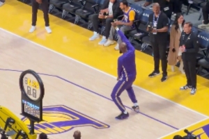 賽前熱身環(huán)節(jié),詹姆斯大秀曼妙舞姿,隨后溜底線空接助飛海斯。