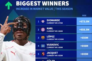 體育資訊03月31日訊 德轉(zhuǎn)盤點了本賽季目前球員身價漲幅榜,其中效力于RB萊比錫的揚·迪奧曼德上漲7350萬歐最多,費爾明身價翻倍成為新的“億元先生”。