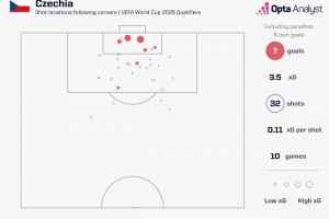 本屆世預(yù)賽共通過角球打進(jìn)7球,捷克位居歐洲區(qū)所有球隊之首