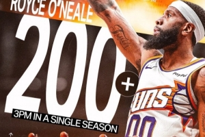 據(jù)太陽官方統(tǒng)計,這是奧尼爾賽季第200記三分,是隊史第六個達(dá)到這一成就的球員。