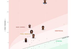 Unethical Hoops的“無(wú)德”指數(shù)主要依靠罰球數(shù)量vs出手?jǐn)?shù)的比值來(lái)進(jìn)行計(jì)算,數(shù)值越大,越是“沒(méi)有道德”;