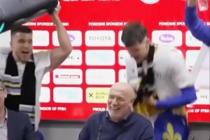波黑主帥巴巴雷茨出席賽后發(fā)布會,波黑球員帶著音響闖入發(fā)布會現(xiàn)場,慶祝球隊晉級世界杯。