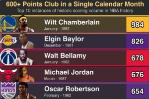 單月總得分Top10:張伯倫984分無敵 喬丹四哈登九 東契奇守門員
