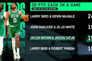 這是雙探花第194場(chǎng)同砍20+,隊(duì)史第三,距離第二的哈弗里切克和喬喬·懷特組合只差2場(chǎng),隊(duì)史第一的是伯德和麥克海爾的249場(chǎng)。