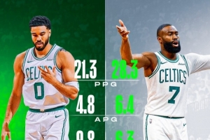 期間,杰倫·布朗場均數(shù)據(jù)28.3分6.3籃板6.4助攻,投籃命中率45.5%,三分32.2%。