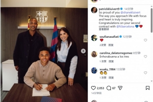 體育資訊4月2日訊 克魯伊維特更新社媒動(dòng)態(tài),曬出18歲兒子肖恩與巴薩B隊(duì)續(xù)約的照片。