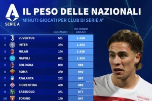 體育資訊4月2日訊 德國轉(zhuǎn)會(huì)市場(chǎng)統(tǒng)計(jì)了意甲各隊(duì)球員在這個(gè)國際比賽日的出場(chǎng)總時(shí)間,并列出榜單,尤文、國米、米蘭前三。
