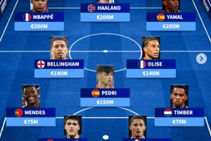 前鋒:姆巴佩(2億歐)、哈蘭德(2億歐)、亞馬爾(2億歐)