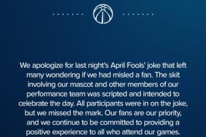 體育資訊04月03日訊 奇才官方今日發(fā)布聲明,表示為愚人節(jié)惡作劇向球迷道歉。