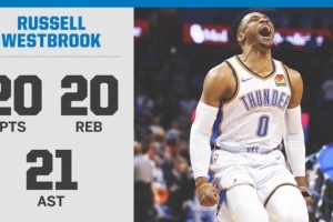 至此,威少成為NBA上第二位單場(chǎng)比賽打出20+20+20超級(jí)三雙的球員,第一位是1968年2月4日的張伯倫(22分25籃板21助攻)。