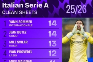體育資訊4月3日訊 足球數(shù)據(jù)網(wǎng)站Squawka統(tǒng)計(jì)本賽季意甲門(mén)將零封榜,索默14次第一,邁尼昂第五,迪格雷戈里奧第七。