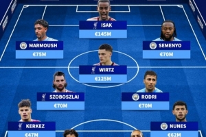 前鋒:馬爾穆什(曼城,7500萬)、伊薩克(利物浦,1.45億)、塞梅尼奧(曼城,7000萬)